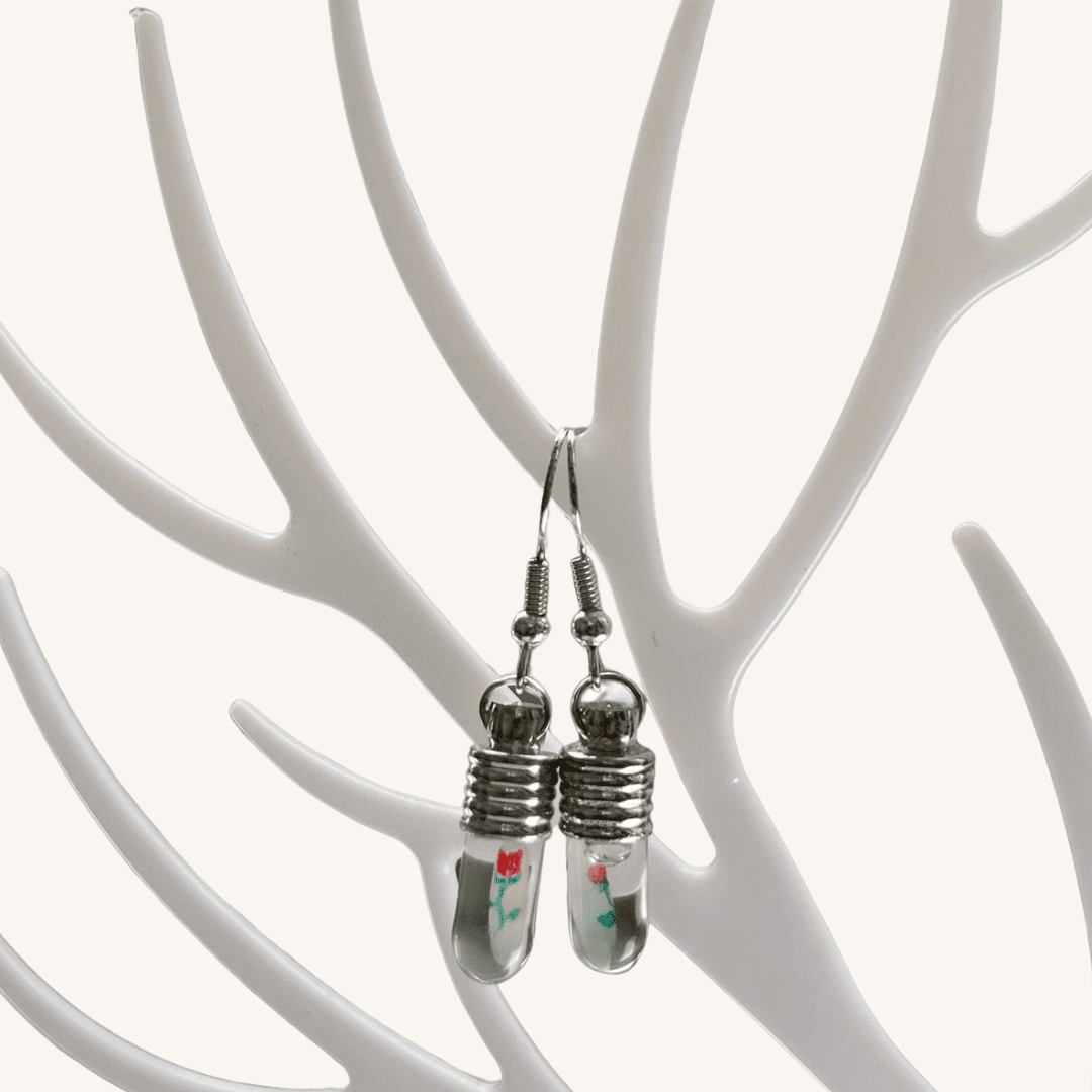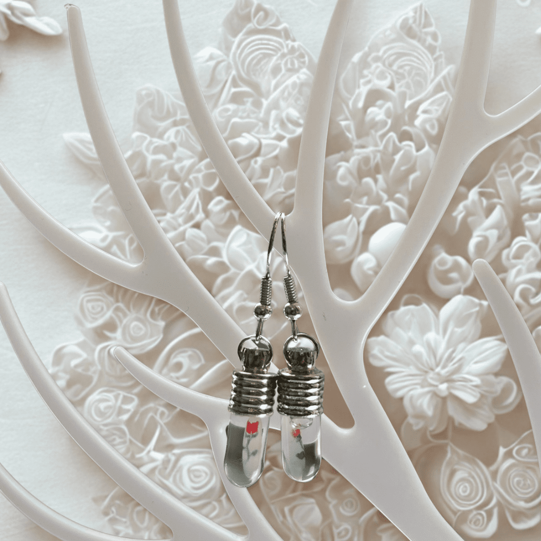 Dans chaque fiole miniature, un grain de riz gravé à la main ou une fleur miniature peinte capture un message, un prénom ou une émotion — suspendu dans un pendentif de verre lumineux.